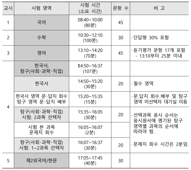 모든 수험생은 1교시 국어 영역 시험 시작 전인 08:10까지 시험실에 입실 완료해야 합니다. 매 2, 3, 4, 5교시 시험 시작 10분 전까지 시험실에 입실해 있어야 하고, 1교시를 선택하지 않은 수험생도 08:10까지 입실 후 시험 감독관의 안내대로 대기실로 이동해야 합니다.